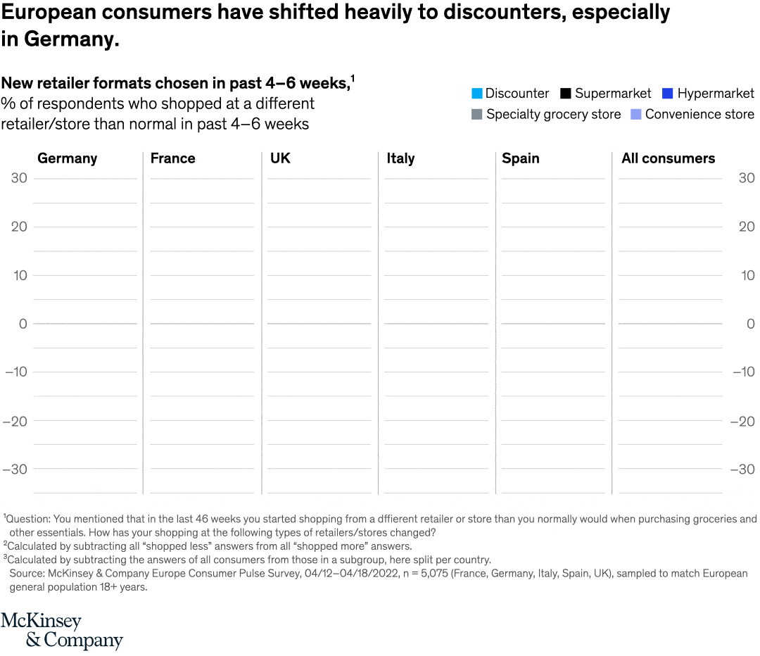 August 3, 2022, European consumers have increasingly been opting for more affordable retailers. According to our latest European Consumer Pulse Survey, of the consumers who decided to shop at a different retailer in the previous four to six weeks, most turned to discounters. Consumers also reported lower use of other retail formats—particularly specialty grocery and convenience stores, which tend to be higher priced.